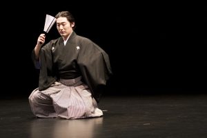 The image features a traditional stage performer seated gracefully on a dark, minimalist stage, creating a strong contrast that draws attention to the subject. The performer is dressed in formal Japanese attire, including a dark kimono paired with a patterned hakama, reflecting cultural elegance and tradition. Holding a folding fan near the face, the individual appears calm and focused, suggesting a moment from a classical performance or theatrical art form. The simple background and soft lighting enhance the dignified atmosphere, highlighting the performer’s posture and the refined details of the costume.