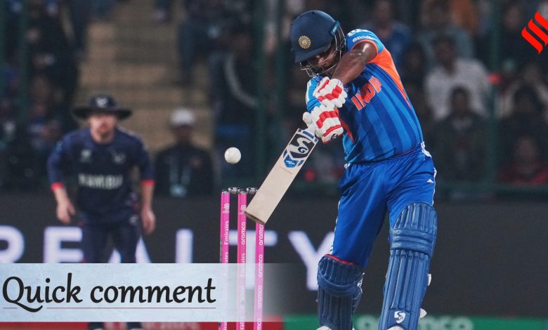 In an attempt to get that extra microsecond to launch his big shots, or too afraid to go to the front foot, Sanju pre-meditates and takes a step back. Mind too muddled to take the right decision instinctively, he goes to the field with pre-conceived plans. This ploy might work against lesser bowlers and that also not for too long as it was seen against Namibia’s not-quite-world class bowling department at Kotla in India’s second game of the T20 World Cup.