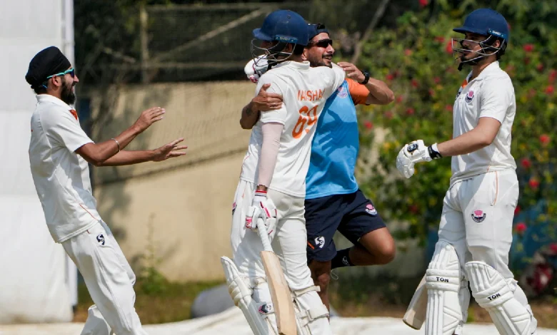 Ranji Trophy Jammu and Kashmir Jammu and Kashmir’s Vanshaj Sharma celebrates with teammates after winning the Ranji Trophy second semifinal cricket match between Bengal and Jammu and Kashmir, at the Bengal Cricket Academy Ground, in Kalyani, Nadia district, West Bengal, Wednesday, Feb. 18, 2026. (PTI Photo)
