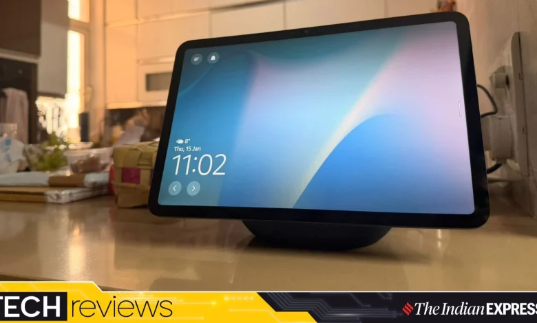 The Echo Show 11’s home screen surfaces recently played music, smart home shortcuts and widgets, reinforcing its role as a passive, always-on household companion. (Image: Nandagopal Rajan/The Indian Express)